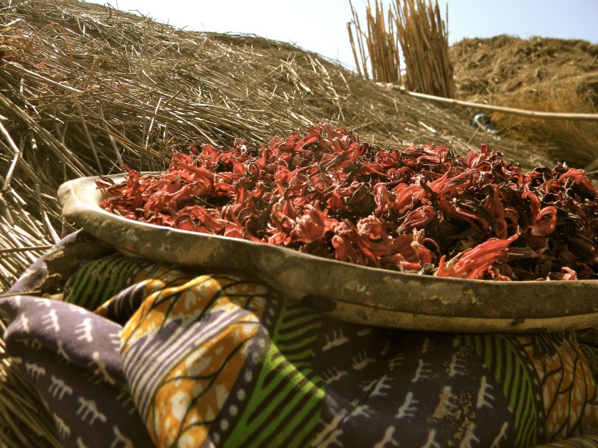 Hibiscus flowers drying on a thatched roof, soon to become bissap, also known as dableni, a sweet juice infusion enjoyed cold.