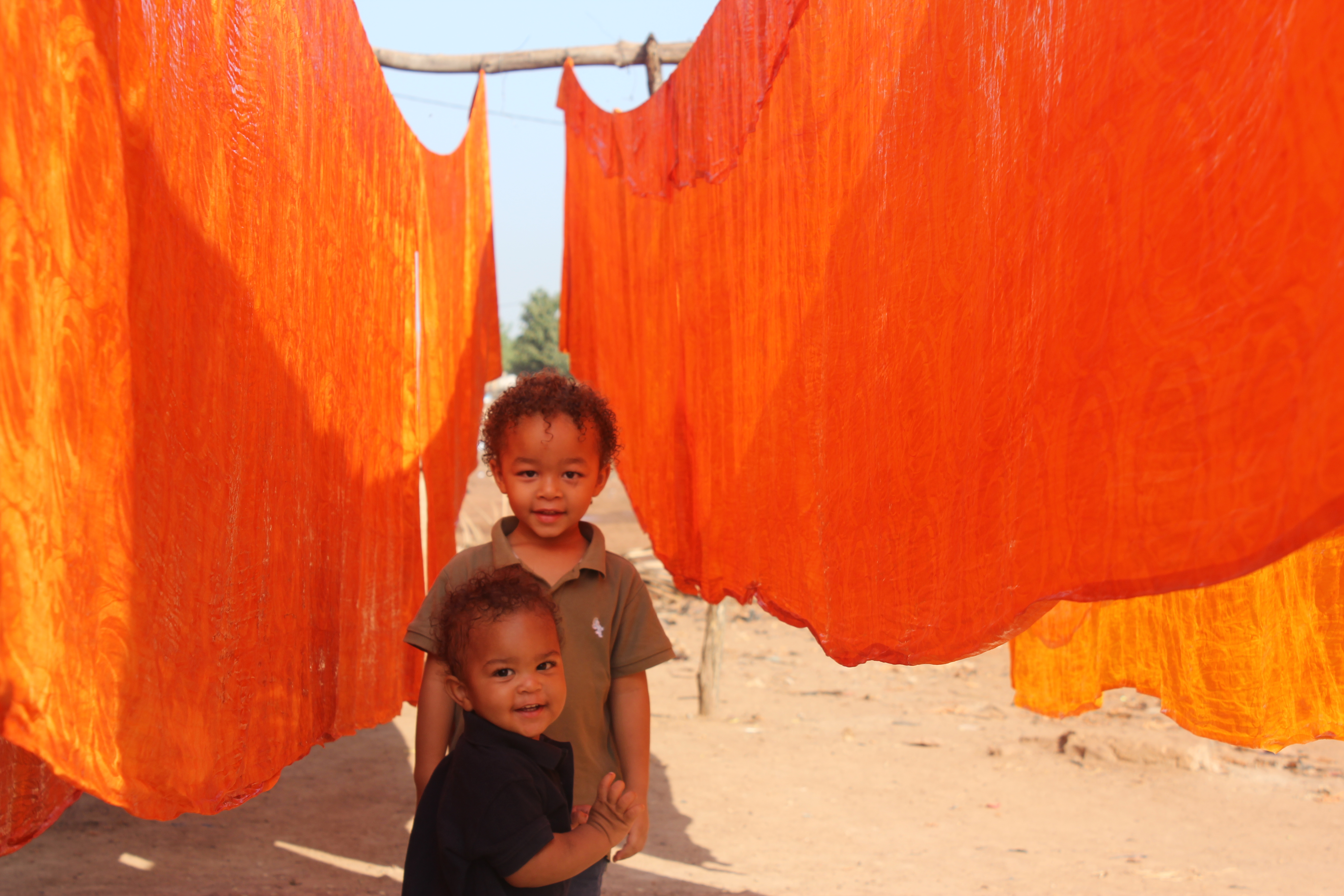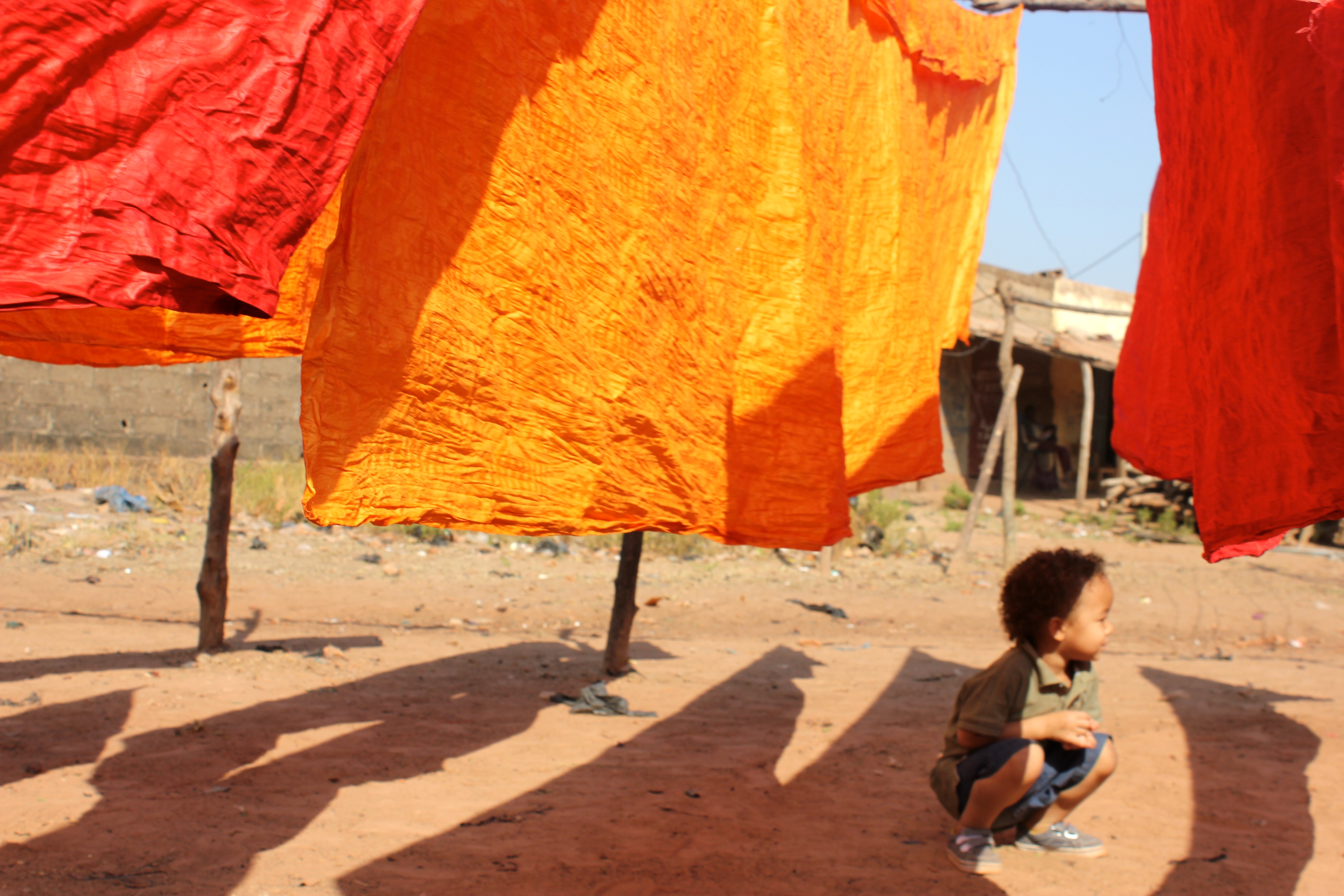 Once the fabric is dyed, it’s draped over walls or attached to clotheslines to dry in the sun, and the depth and intensity of the colors astounds. We managed to arrive one weekday morning just as the first pieces were going up: first reds, oranges, yellows …