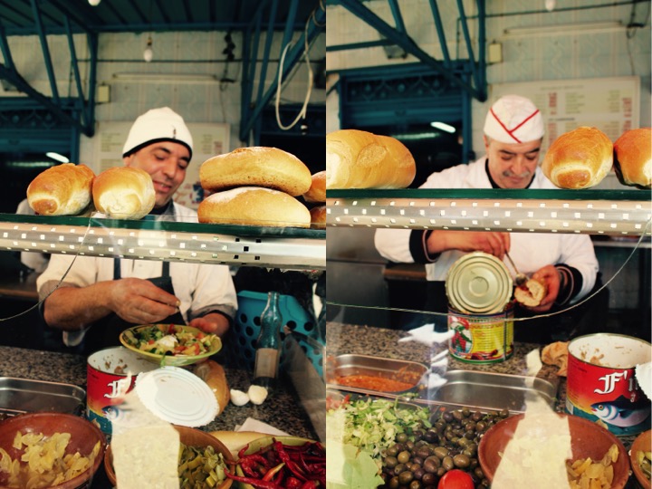 A simple, and simply delicious, Tunisian fricassee, prepared by the most charming of sandwich assemblers.