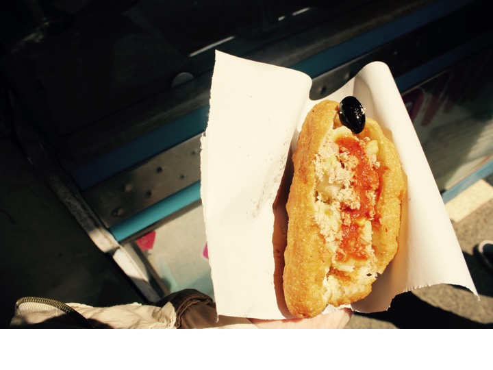 The fricassee is all about this special bread: a golden, fried roll, a bit spongy, but perfectly sturdy to house a festive mélange of Mediterranean delights: tuna, potatoes, egg, méchouia, olive oil, harissa, salt, an olive for some spunk.