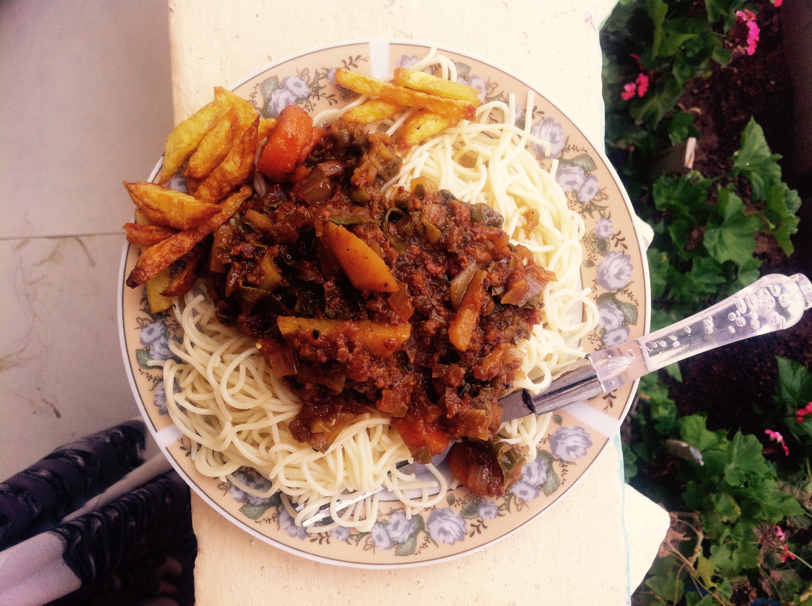 Eats & Drinks, Somaliland Published on May 15, 2015 Leave a Comment what’s to eat #31 written by erinwrote A lunch of spicy, ground beef sauce with potatoes, carrots, and hot green peppers over spaghetti. Garnish of french fries ! Eaten on the front porch, outside Hargeisa, Somaliland. Share this: Click to share on Facebook (Opens in new window) Facebook Click to share on Pinterest (Opens in new window) Pinterest Click to email a link to a friend (Opens in new window) Email Click to share on X (Opens in new window) X Click to share on Tumblr (Opens in new window) Tumblr More Click to print (Opens in new window) Print Like Loading... Related
