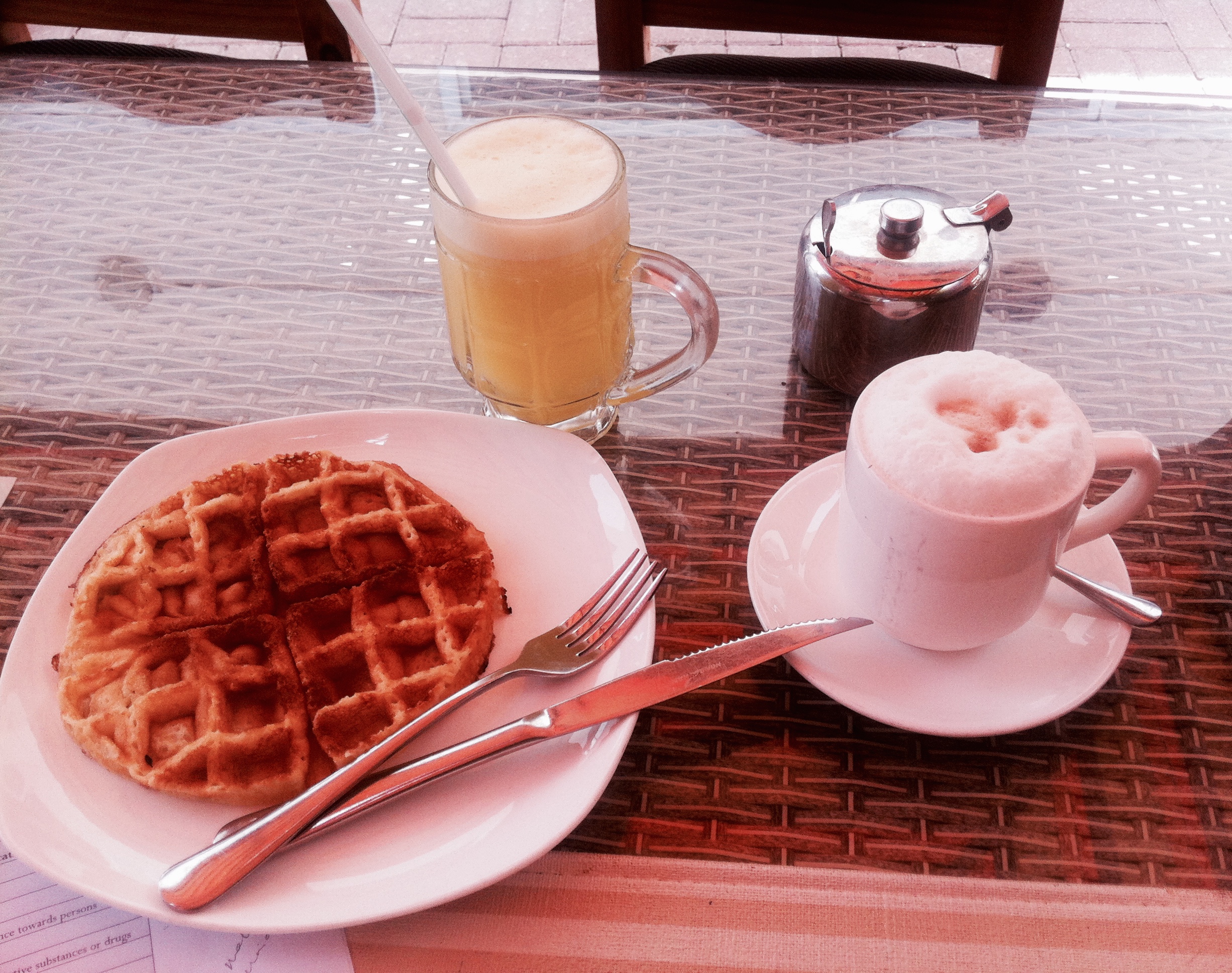 Fresh orange juice, a latté, and a funky, pre-frozen waffle.