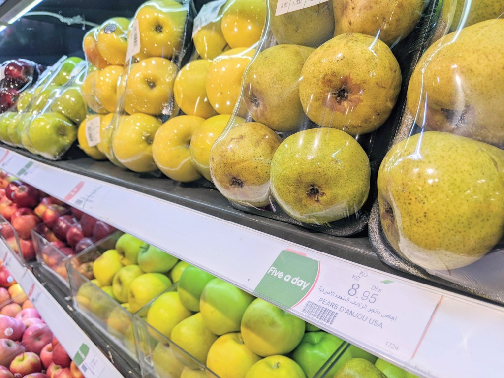 Since moving to Dubai I have learned that Morocco and South Africa produce great blueberries, I’ve had my first rambutan (smuggled in a suitcase from Sri Lanka, not from the grocery store shelves), and I can say from experience that Hass avocados from Mexico are much worse for the wear after a very long voyage to reach the Gulf.