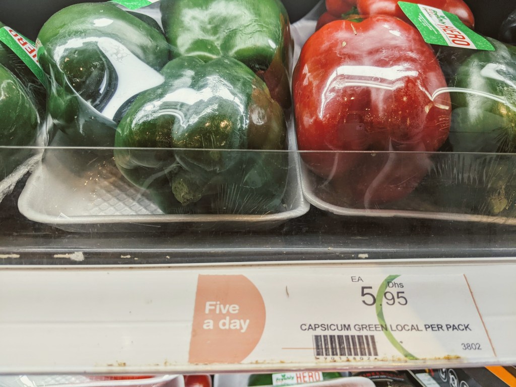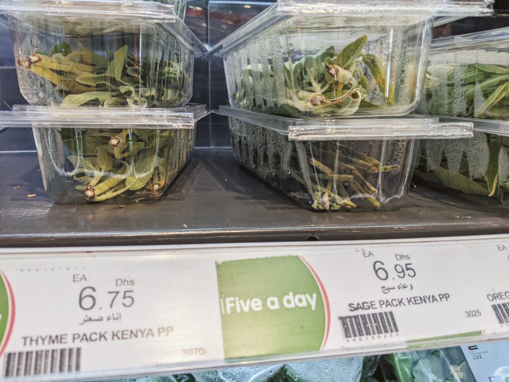 Here, the climate change-sensitive among us find some relief: for much of the year, a collection of UAE-grown veggies are available, including cucumber, tomato, bell peppers, and lettuce. Indeed, I do most of my shopping through a UAE farm that retails (and delivers!) to customers.