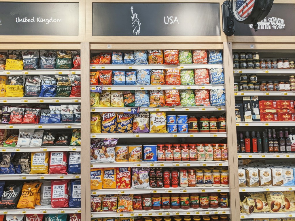 In case you’re curious, here’s a look at what some corporate buyer (perhaps not from the U.S.?) has deemed an appropriate representation of our national culinary identity (-ies), and evidently what immigrants from the U.S. demand from their grocers: various types of chips, and pasta sauce. There we are, folks, in all our glory. (In a meaningful politico-cultural statement, (Huy Fong Foods) Sriracha hot sauce was recently relocated from the “USA” shelving unit to the “Thailand” shelving unit. So there’s that).