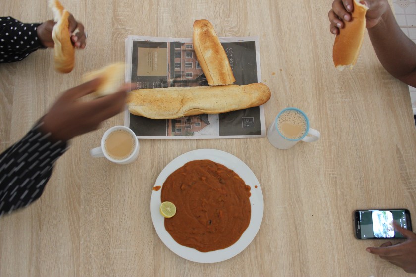 Like most cross-cultural foods, there are a zillion and one recipes for loxoox, from Somalia and Somaliland to Djibouti, Yemen, and even as far as Israel. Locally, loxoox is eaten for breakfast with Somali tea, or honey and goat ghee, or olive oil. Oftentimes , Somali breakfasters plop a small stack of loxoox on a plate and pour tea right on top of it. Usually cooked on a cast iron skillet with a thin veneer of vegetable oil rubbed across it using a folded piece of loxoox, the batter is drizzled onto the center of the pan and then pushed outwards in a circular motion with a spoon, spatula, or the bottom of a cup, creating a beautiful swirl.