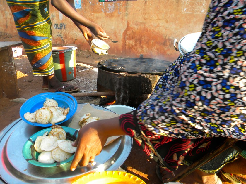 Breakfast on the go: ngɔɔmi. sourdough-like fried pancakes sprinkled with sugar, or drizzled with honey. The funny thing about street-side breakfasts in Bamako is that they never seem to be around during breakfast time: foods prepared fresh in the street (donuts, cakes, egg sandwiches) vanish by 8:30am, devoured by the masses who rose hours earlier for morning prayer. Luscious fruit stands abound on nearly every street corner, but they’re open only from early afternoon until 1:00am, 2:00am, or as late as the saleswomen can keep their eyes open. Meaning: if you’re searching for a quick breakfast around 9 or 10am…bon courage. Breakfast in Bamako waits for no one.