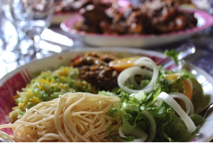 A colleague (and s’mores enthusiast) married his fiancée in the weeks before Ramadan, and graciously invited our staff to a celebratory lunch at his family’s home. While dozens of family and friends ate from shared platters throughout the house, we special guests (!) were seated around a dining table, and served enough food for a crowd twice our number. A few highlights here, of broken bread and hearty congratulations. Camel! Or was it goat? An outrageous most generous portion of spaghetti. And custardy, fruit-filled desserts. After stuffing ourselves full, we headed out in gratitude, and gave our best to the newly- weds. Wishing you long and happy unions.